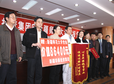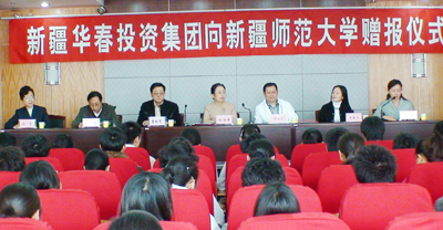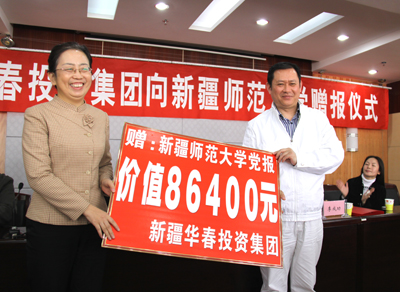 在陽春3月的25日下午,新疆華春投資集團向新疆師范大學的贈報儀式在新疆師大教學主樓學術報告廳隆重舉行。華春投資集團首期出資現金將近9萬元,訂購全年度的黨報《新疆經濟報》300份,贈送給新疆師范大學的教師們,方便教師們及時學習了解黨的路線、方針、政策及國內外各項重大信息。新疆華春投資集團為推進新疆教學人才的培育、為新疆和諧社會的構建,從而奉獻出新疆華春投資集團的一份愛心。