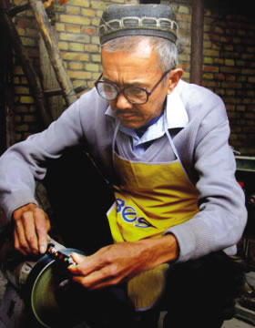 我們在另一條偏僻的小巷里,見到了“塔石罕”最小的兒子艾合買提·塔石,他今年48歲,從18歲開始學藝。由于父親的威望,來拜訪他或買小刀的人很多。我們來到他家時,他正在院中制作小刀,面前擺放著小榔頭、銼、鉆、錐、老虎鉗、砂輪、砂紙等工具,還有一些正等待加工的刀胚。他告訴我們,做小刀的工藝很復雜,要將挑選出的好鋼好鐵進行鍛打、沾火、造型、銼磨、鑲嵌銅、骨、花紋等一系列的工藝,一把好刀要四五天才能做好。我們發現,他制作的小刀柄部均以孔雀頭為造型,上有孔雀羽毛的圖案,看上去華麗而高檔,令人愛不釋手。艾合買提·塔石給我們展示了他的不少“作品”,長短不一,最長的一把折刀拉出刀子有40厘米,明晃晃的,非常漂亮。這種刀是宰羊、殺瓜絕好的工具。艾合買提·塔石在他做的刀子上打印了“5”的字樣,謹防假冒,同時也是質量保證的標記。