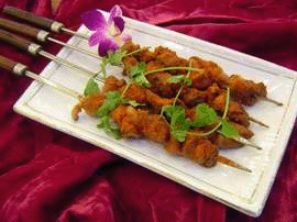 烤羊肉串是將肉切成薄片,一一穿在鐵釬子上,然后均勻地排放在烤肉爐上,撒上精鹽、孜然和辣椒面,上下翻烤數分鐘即可食用。味道微辣中帶著鮮香,不膩不膻,肉嫩可口。過去,做烤肉串用的釬子都是用紅柳的細條截削而成的木釬。現在,這種原始的木釬很難看到了。這種肉食不僅深受新疆各族群眾喜愛,也深受關內一些地區漢族群眾歡迎,現在關內很多地區都有烤羊肉串了,可以說烤羊肉串以它獨特的風味成為風靡全國的一種小吃。