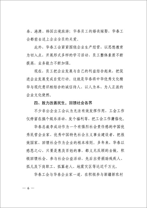 專報認為:新疆華春工會就是個例外。對內,建設規范有序、公正合理、互利共贏、和諧穩定的社會主義新型勞動關系,促進企業發展,維護員工權益,率先簽訂工資集體協商合同,勞資雙方高度和諧,實現企業與員工的雙贏,被自治區黨委、政府授予“模范勞動關系和諧企業”稱號;