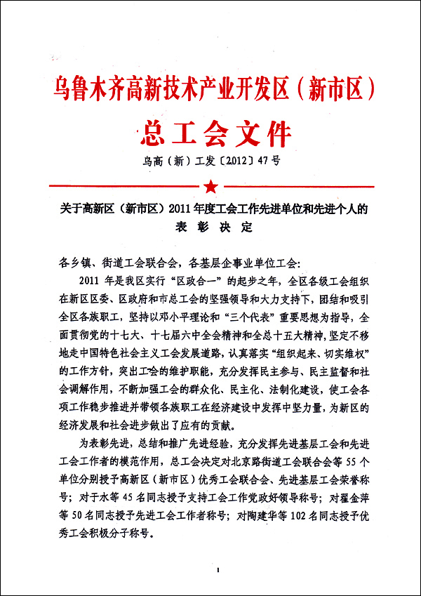 從高新區(新市區)總工會、到全國總工會、工商聯、新疆自治區黨委,都對一個非公企業工會如此肯定,這不但在全疆尚屬首次,而且在全國也是首例!