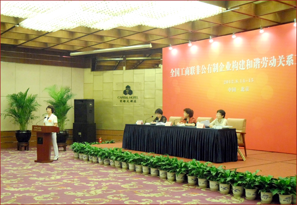 為進一步貫徹落實中央16號文件精神、推動非公有制企業(yè)構建和諧勞動關系,由全國工商聯(lián)主辦的、由中央統(tǒng)戰(zhàn)部、國務院法制辦、人力資源和社會保障部、全國總工會、中國勞動保障科學研究院等有關單位負責同志和各省級工商聯(lián)與全國非公有制企業(yè)代表140余人參加的全國非公企業(yè)構建和諧勞動關系座談會,于8月14-15日在北京隆重召開。來自中國西部邊陲的新疆華春投資集團的工會主席高青,代表李成功總裁作了大會典型發(fā)言,在大會中引起強烈反響,受到高度肯定。