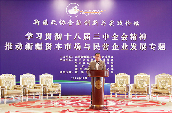 在舉世矚目的黨的十八屆三中全會剛剛閉幕之際,新疆政協金融創新與實踐第二次論壇于11月15日在昆侖賓館隆重召開。自治區政協主席努爾蘭•阿不都滿金講話,自治區黨政各部門領導與金融界保險及主要企業的代表約250人參會。自治區政協常委、新疆華春投資集團李成功總裁做了題為《進一步解放思想 加快民企上市步伐》的重點演講。