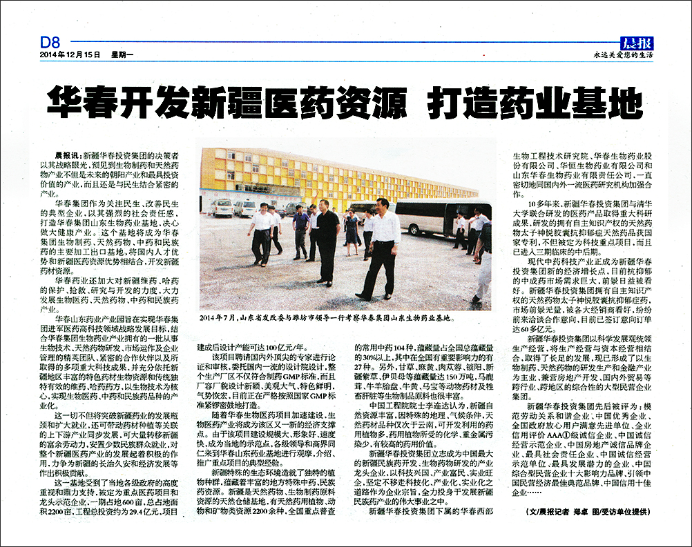大健康產業與民生結合緊密,不僅是最具投資價值的黃金產業,又是功德無量的產業,得到媒體的關注,晨報于12月15日以“華春開發新疆醫藥資源 打造藥業基地”為題,進行了半個版的報道。