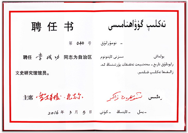 自治區政府主席向新疆華春投資集團總裁李成功頒發館員聘書
