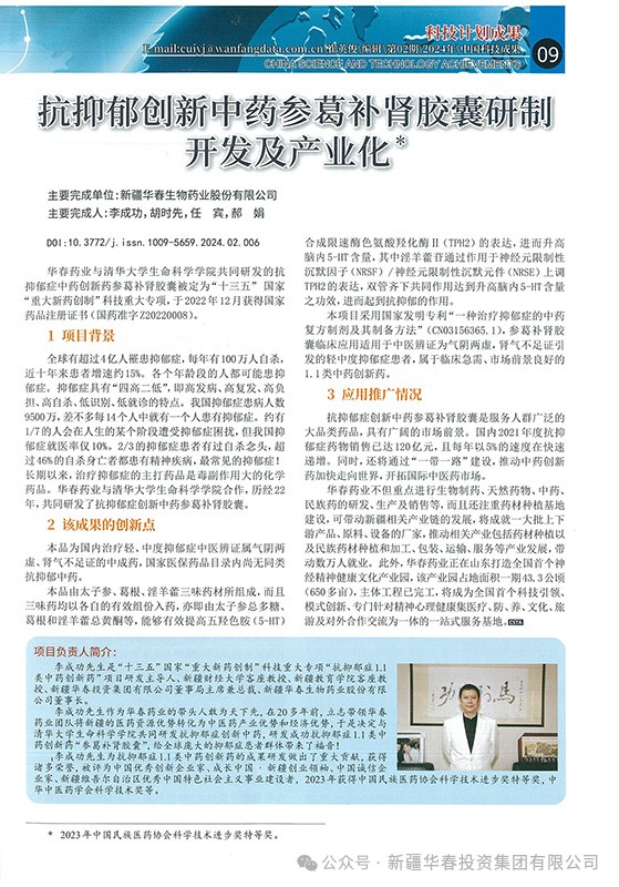 《中國科技成果》期刊發(fā)表 華春藥業(yè)抗抑郁創(chuàng)新中藥研究成果