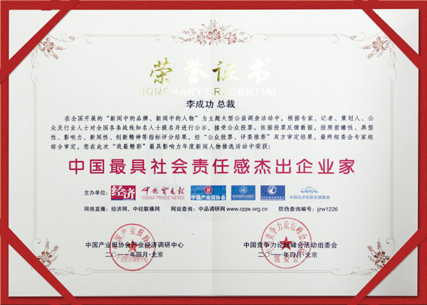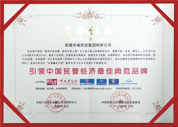 于4月23-24日在北京隆重召開的“2011中國企業競爭力年會暨誠信與發展高峰會”上,由中國產業經濟調研中心發布了《2011中國最具競爭力企業年度排行》和《中國經濟最具影響力時代新聞人物》,新疆華春投資集團榮獲“引領中國民營經濟尚佳典范品牌”、總裁李成功榮獲“中國最具社會責任感杰出企業家”稱號。