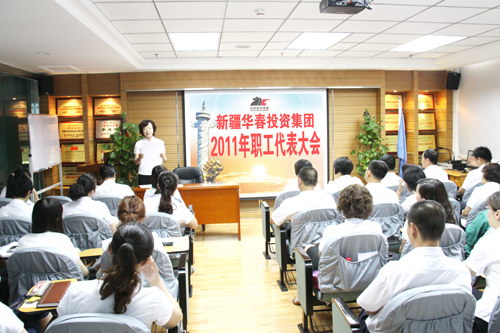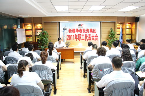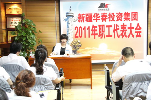 新疆華春投資集團有限公司職工代表大會于2011年6月11日上午在華春集團恒潤公司培訓室召開。51位參會的職工代表,肩負著集團與各子公司的430多名員工的重托,對“三項集體合同”即集體合同、工資集體協商合同和女職工權益保護專項集體合同草案進行了審議,經大會討論和民主表決,“三項集體合同”草案獲得通過,并形成職工代表大會決議書。