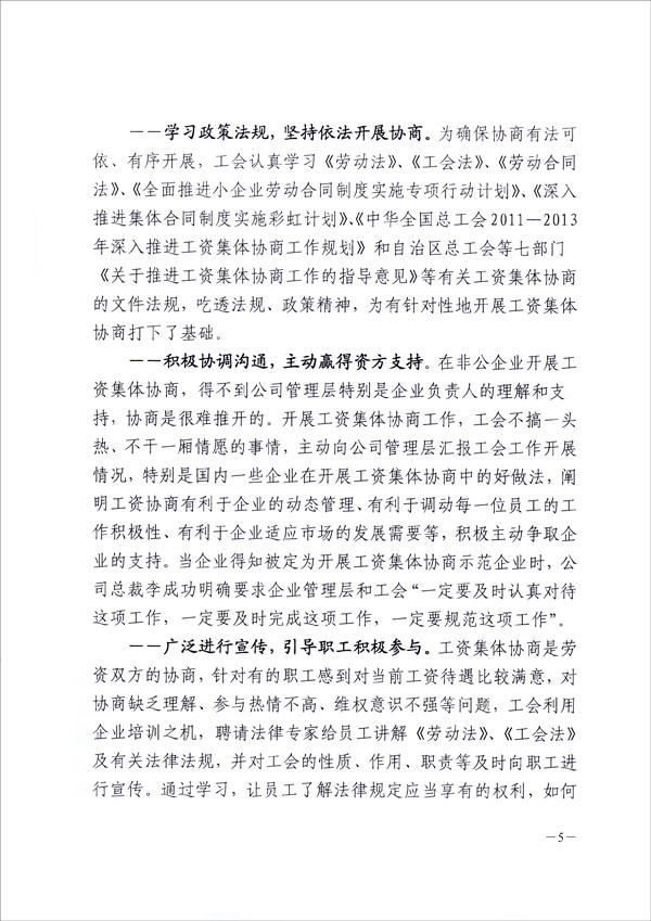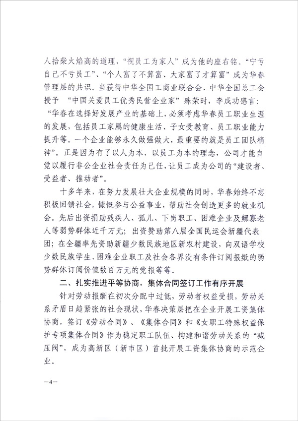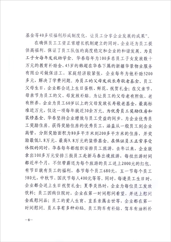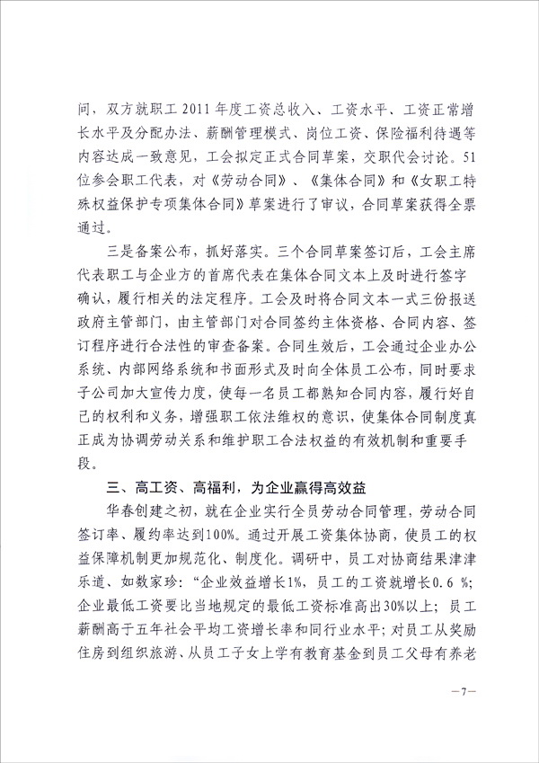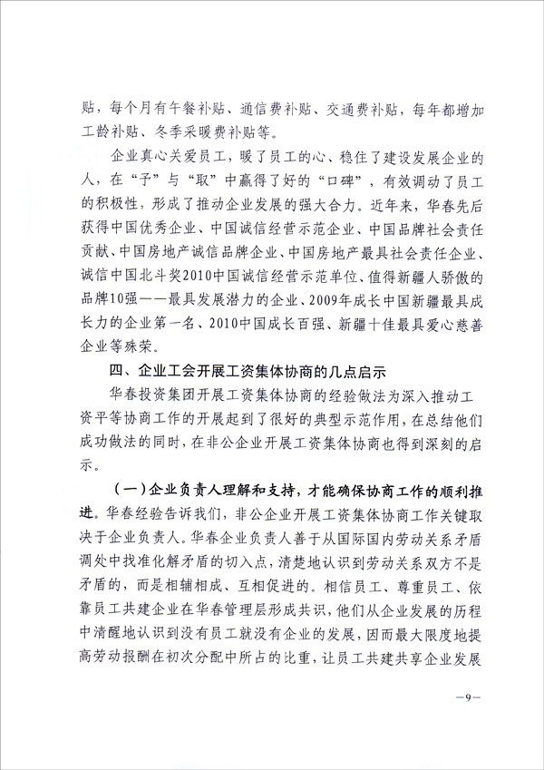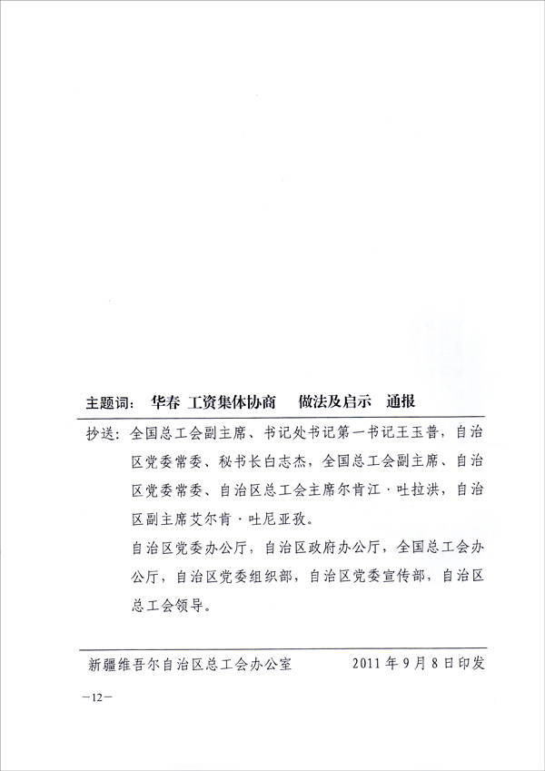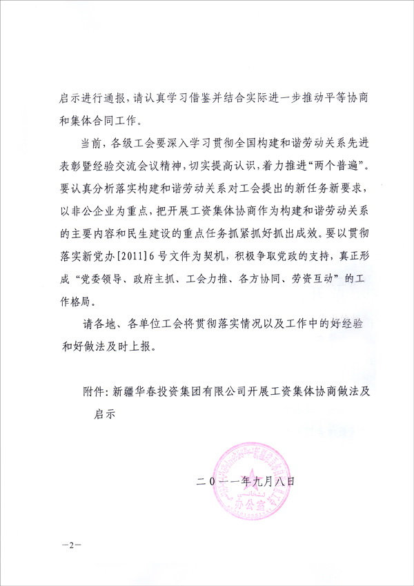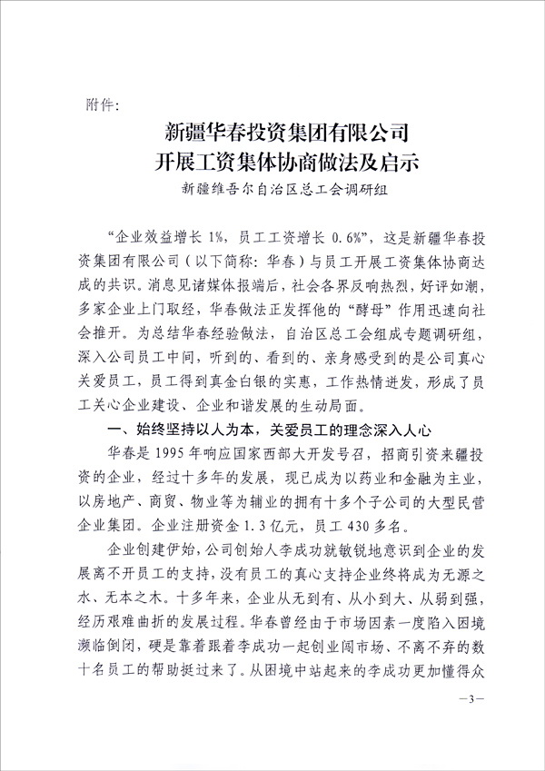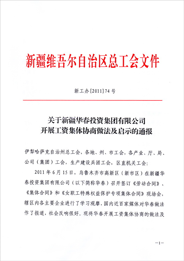 為在全疆推進工資集體協商、構建和諧勞動關系,新疆維吾爾自治區總工會于9月8日向全疆各地州、各產業、廳、局、公司集團、生產建設兵團、區直屬機關工會,正式下發了長達十幾頁的“關于新疆華春投資集團有限公司開展工資集體協商做法及啟示的通報”的紅頭文件,要求全疆認真學習與借鑒。