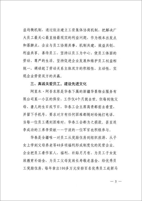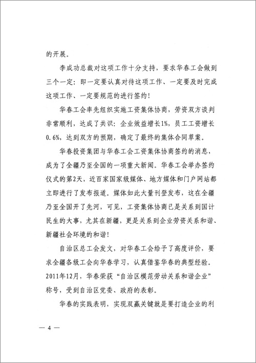 專報認為:新疆華春工會就是個例外。對內,建設規范有序、公正合理、互利共贏、和諧穩定的社會主義新型勞動關系,促進企業發展,維護員工權益,率先簽訂工資集體協商合同,勞資雙方高度和諧,實現企業與員工的雙贏,被自治區黨委、政府授予“模范勞動關系和諧企業”稱號;