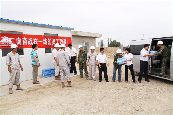 6月30日,新疆華春投資集團工會主席高青和行政辦副主任鄭培君、華春集團子公司新疆恒潤實業有限公司辦公室主任及集團編輯部全員一行,將一箱箱的統一綠茶和茉莉蜜茶、一件件的純凈水及綠豆、冰糖、白糖等降溫防暑飲料與物品,送給奮戰在五家渠華春毛紡工業園項目建設工地的一線員工,同時也送去了李成功總裁和華春全員的關愛之心。一線員工們接到公司送來的慰問品,深深感受到公司的關懷,“感謝李總裁對我們的關心!謝謝公司對我們的慰問看望!”