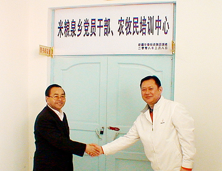 自治區黨委副秘書長農辦主任代寧祥和新疆華春投資集團董事局主席兼總裁李成功先生為米糧泉鄉黨員干部農牧民培訓基地揭牌