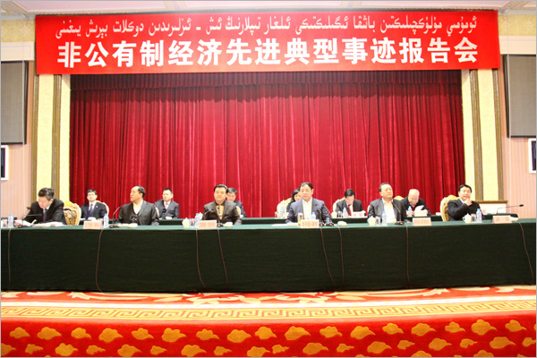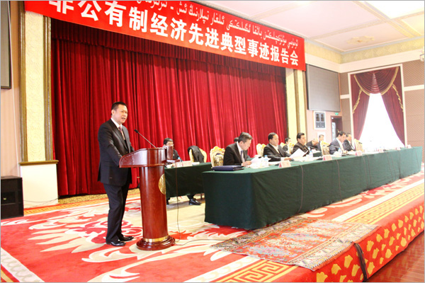 新疆隆重召開非公有制經濟先進典型事跡報告會--新疆華春集團有限公司李成功總裁在會上報告先進典型事跡