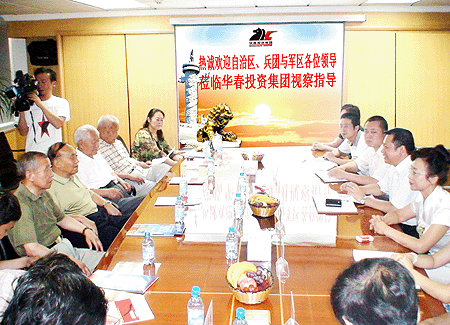 6月5日上午,新疆國際國內公共關系協會考察團前往中國優秀企業——新疆華春投資集團進行考察、調研。考察團由自治區黨委原副書記張思學、原蘭州軍區副政委、新疆軍區政委唐廣才、新疆生產建設兵團原政委郭剛、新疆生產建設兵團原司令員劉雙全和自治區招商發展局武茂雄處長組成。